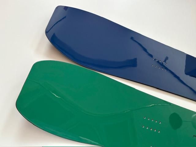 大きなノーズに、小さいサイドカーブの為ボードを動かしやすく狭いツリーの間のパウダーも難なく滑走可能。