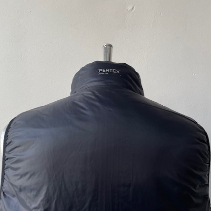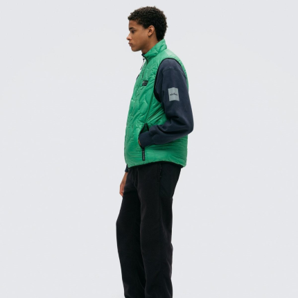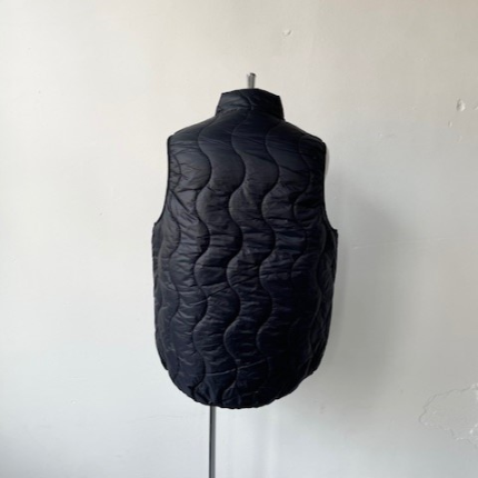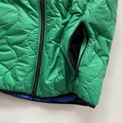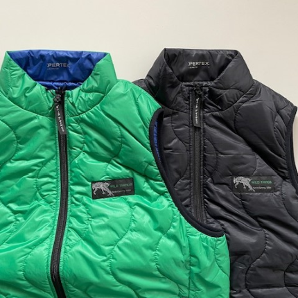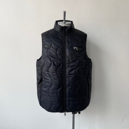 表側は往年のWILD THINGSで人気を集めた波キルトに WILD CATの旧ロゴ復刻ネームでレトロアウトドアな雰囲気。裏側はBEL AY J ACK E Tベースでステッチを表に出さず、ロゴもリフレクタープリントでソリッドな雰囲気。表裏両側にPERTE X QUANTUMを使用。中綿にプリマロフトを使用したリバーシブルの中綿ベスト。