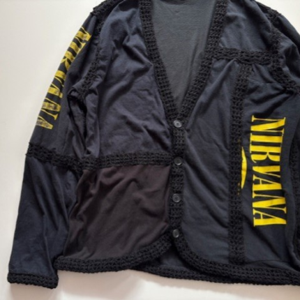 OLD PARK / CROCHET CARDDIGAN ¥46,200 tax included ユーズドのバンドTシャツを解体し、お馴染みのパッチワークデザインにクロシェ編みでトリミングを施したクロシェカーディガン。ボディにはTシャツを使用し、編み目が透けて見えるのでレイヤードも楽しめます。 ※古着を使用していますので、リメイク品特有のダメージがあることなどをご理解いただける方へご購入いただいております。OLD PARKの品物は1点ものとなっております。予めご理解の上、お買い求めください。