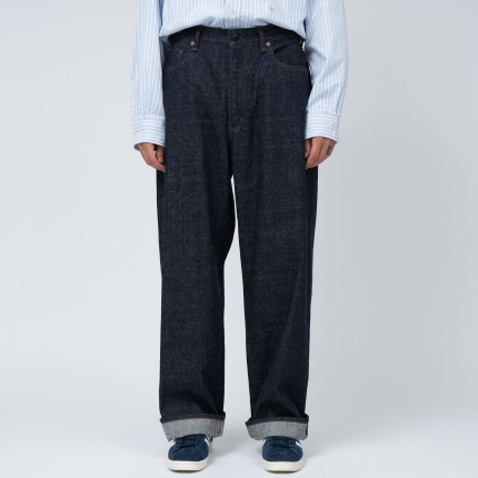 nanamica / Selvage Denim Pants ¥ 33,000 tax included ・ワイドストレートカットの5ポケットデニムパンツ。 ・オリジナルのセルビッチデニムを開発。 ・リサイクルポリエステルの外側をコットンで覆った太番手のムラ糸を独自で開発し、ロープ染色にて染色。この糸をタテ糸に使用し、ヨコ糸にはヴィンテージ感のある太番手のコットンネップ糸を使用。 ・旧式のシャトル織機で空気を含みながらゆっくり織り上げたデニムは、生地の目が詰まらず凹凸感のある風合いで、穿いていくごとに体に馴染み、セルビッチデニム独特の色落ちが特徴。 ・フロントファスナー開き。 ・股下には脚の可動域を広げるマチ付き。 ・ワンウォッシュ仕上げ。 (メンズモデル/身長:184cm 着用サイズ:34) SHIRT:Button Down Stripe Wind Shirt