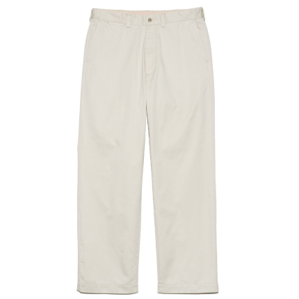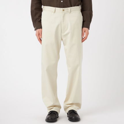 nanamica / Wide Straight Chino Pants ¥ 26,400 tax included ・ワイドストレートカットのチノパンツ。 ・リサイクルポリエステルの外側をオーガニックコットンで覆った二層構造のカバーリングコアヤーンを使用し、クラシックなチノ素材を製作。コットンの肌触りに、軽量且つ耐久性があり乾きやすいという機能性をプラスしたnanamicaオリジナルのハイブリッド素材。 ・デザインベースは50年代のU.S.Army/チノトラウザーズ。 ・フロントファスナー開き。 ・後ポケットは隠しドットボタン仕様。 ・股下には脚の可動域を広げるマチ付き。 (メンズモデル/身長:185cm 着用サイズ:34) SHIRT:Button Down Wind Shirt