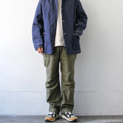 特徴的な大きなフロントポケットは、容量を増す為にポケット口を広く、膨らみを持たせた状態で叩きつけています。街中での着用はもちろん、アクティブなアウトドアシーンにも使い勝手の良い定番パンツです。
