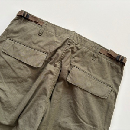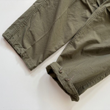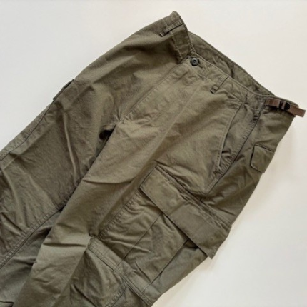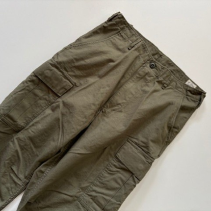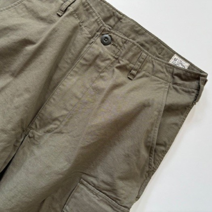 orSlow / VINTAGE FIT 6 POCKETS CARGO PANTS ¥27,500 tax included 1960年代US ARMYがUTILITY PANTSとして採用していたカーゴパンツをモチーフに作成。 当時のRIP STOP POPLINの素材を分析しオリジナルで素材から開発しました。 RIP STOPという素材名称は破れ止めという事で生地を織る際に細番手の糸の間に、太番手の糸を格子状に織り込み表面に格子状の織模様が見える素材です。 破れた際に太番手の糸の部分で破れを食い止めるためにそのような仕様になっています。 1960年代当時のRIP STOP POPLINは特徴的でやや光沢があり緯糸の太番手部分は強調されるのですが経糸の太番手部分は強調されず独特な表情に見えます。 orslow V5260は 1960年代の実物独特の素材感とシルエットをできる限り再現しました。 細番手でしっかりと打ち込まれており当時は軍が採用していたという事もあり丈夫であるという事が言えます。裾にはドローコードが付き様々な着こなしが出来ます。 流行に左右されることなく丈夫で長持ちするカーゴパンツです。 【orSlow(オアスロウ)】 デニムを中心とする日本のファッションブランド。2005年に仲津一郎(Ichiro Nakatsu)がオアスロウをスタートする。 19世紀終わりから20世紀にかけた時期のスタンダードな服、特にミリタリーウェアやワークウェアと現在もファッションとして着られる服からインスピレーションを受け、“slow(ゆっくりと)”に自身のフィルターを通してデザイン。めまぐるしく変わっていく現代社会においてゆっくりと手を掛けた物作りを行う。 ヴィンテージのマシンを使い、日本製に拘ったクオリティーの高いアイテムを生産。デニム以外にもチノパンやペインターパンツ、アメリカンカジュアルのアイテムを展開している。