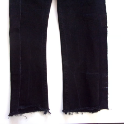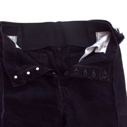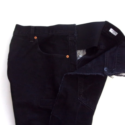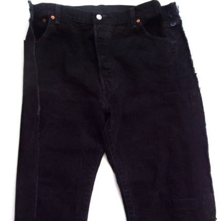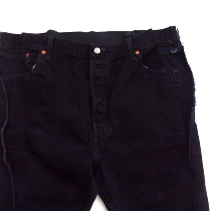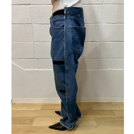 デニムパンツをマジックテープでサイドで留めて様々なシルエットに調整して穿くことが可能なパンツ。