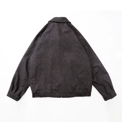 衿はレギュラーカラーでチンストラップが付くことで、立てても、タブを留めても、よりブルゾンライクに着こなすことも出来るのがシャツ襟タイプの魅力です。