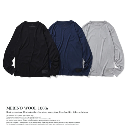 TAION / MERINO WOOL UNDER WEAR LONG T-SHIRT ¥5,940 tax included 上質なメリノウール100%を使用した、TAIONのアンダーウェア。 体温をしっかり守る抜群の保温性、肌に添う滑らかな着心地を追求しました。 蒸れにくく快適な着心地で、抗菌・防臭性も備えた最適なアンダーウェアです。 TAIONのインナーダウンと一緒に着用いただくと更に暖かく過ごしていただけます。 【商品スペック】 ・上質なメリノウール100%を使用しています。 ・抗菌・防臭性を備えた生地を使用しています。 ※収納袋は付きません。 ※男性用サイズです。