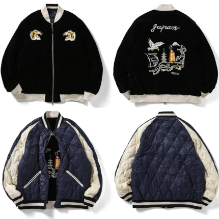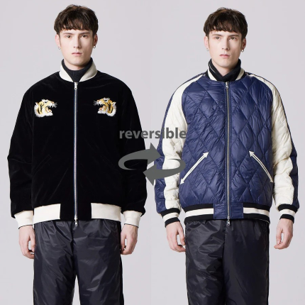 TAION / REVERSIBUL "SKAJAN" DOWN JACKET 【UNISEX】 ¥19,800 tax included スカジャンとダウンを組み合わせた、スカジャン風リバーシブルダウンジャケット。 保温性の高い800FPのダウンを使用し、軽くて柔らかな着心地を実現。 肩まわりや身幅にややゆとりをもたせたシルエットで、インナーに厚手のトップスを合わせてももたつかず、ストレスなく羽織れます。 表側は、毛羽のあるベロア素材にスカジャン刺繍を、裏側は、ダイヤキルトダウンジャケットで、気分やコーデに合わせて楽しめるリバーシブル仕様に仕上げました。 個性的なデザインと、日常で使える実用性を両立した、ダウンウェアです。 【商品スペック】 ・リバーシブル商品です。 ・表地には、ベロア生地に前後スカジャン風の刺繍を入れています。 ・裏地には、高密度ナイロン生地を使用しています。 ・800FPの上質なダウンを使用しています。 ・前たては、YKKファスナーを使用しています。WZIP仕様により、下からスリットを設けることが可能です。 ・衿、袖口、裾に風合いのあるリブを使用しています。 ・表側左右腰には、片玉淵ポケットが付いています。 ・裏側左右腰には、両玉淵ポケットが付いています。 ・ご家庭での洗濯も可能です。 ※収納袋は付きません。 ※男女兼用サイズです。 女性の方:XS〜Sサイズをお勧めします。ルーズに着用希望の方はMやLサイズをお勧めします。