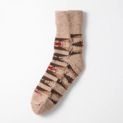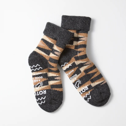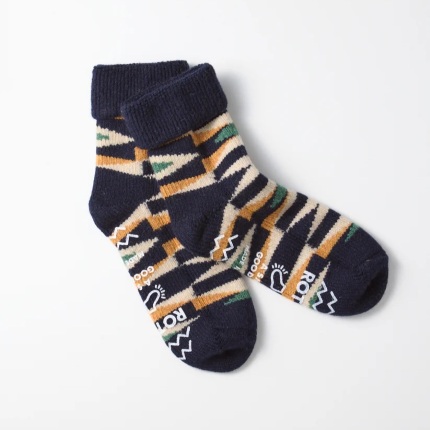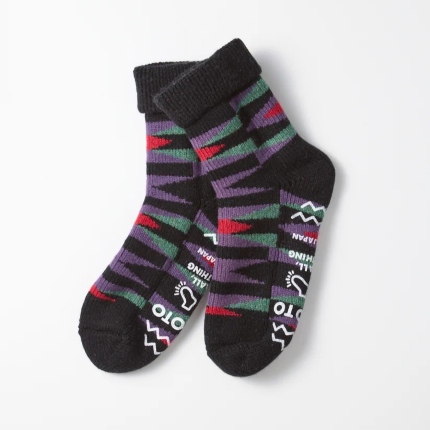 メリノラムウールを贅沢に使用し、漁師用ソックスなどを編み立てるローゲージ編み機で編んだ肉厚のルームソックス。ネイティブアメリカンのファブリックから着想を得ています。ラムウールは繊維が細く、やさしい肌あたりが特徴。また、肉厚なパイル生地は保温性も高く、足元をしっかりと温めてくれるので、冬のギフトとしてもオススメです。