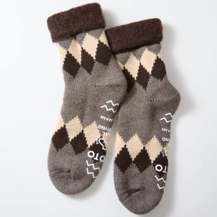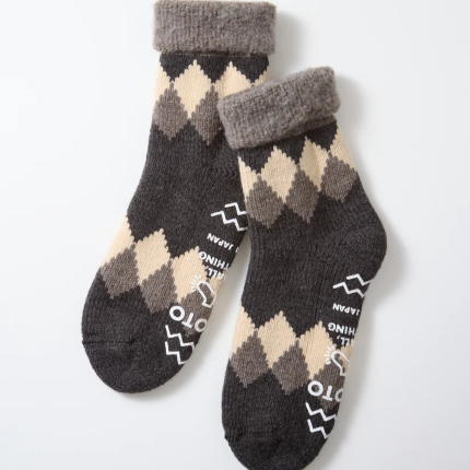 保温性とやさしい肌ざわりが特長の、アクリルとウールの混紡糸を使用したスーパーローゲージのルームソックスです。デザインのインスピレーションは、北欧の伝統的なノルディックセーターから得たもの。ワークソックス用の特殊な編み機で編み立てた後、内側に起毛を施すことで、保温性をさらに高めています。履き口の少し下にはゴムが入っており、折り返しても履ける仕様に。足底のプリントは、デザイン性だけでなく、滑り止めとしての機能も兼ね備えています。