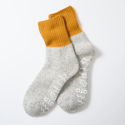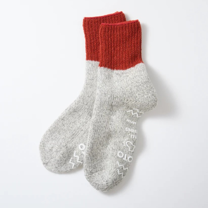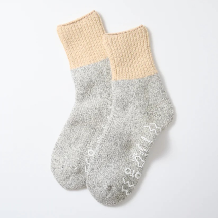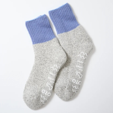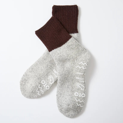 寒冷地で働く漁師や林業従事者のためのワークソックスを編む専用の編み機を使用してつくられたルームソックス。ワークソックスと同じ太番手のウール×アクリル混紡糸をベースに、内側全体を肉厚のパイル編みに仕上げることで、優れた保温性とクッション性を実現しました。足底のプリントは滑り止めグリップとしても機能します。