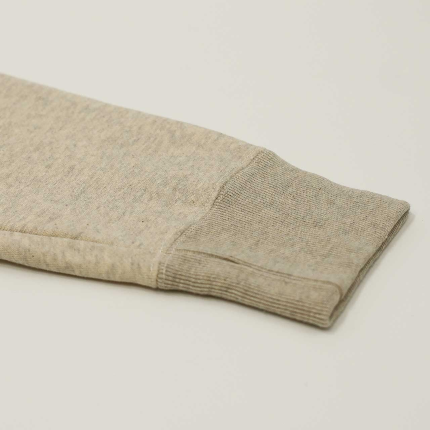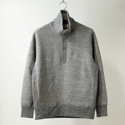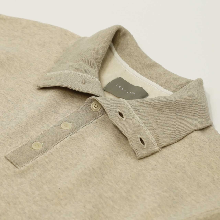 CURLY&Co. / RAFFY TURTLENECK POLO ¥26,400 tax included [ITEM] トルファン、ギザ、スーピマなどの超長綿の落ち綿をリサイクル混紡した、環境に優しいラフィ糸で編み立てた起毛裏毛を用いたプルオーバー。糸の持つ自然なムラ感を活かした表面感があり、かつ裏毛を起毛した後に更にタンブラー乾燥をすることで、高密度でありながらも柔らかくボリュームのある素材に仕上がっています。毎シーズンCURLY&Co.のアイコニック生地として色々なアイテムを展開していますが、今シーズンはボタン仕様のタートルネックのデザインを採用。ボタンを開閉することでタートルにも通常の襟にもなり、2通りの着こなしを楽しめます。ウエスト部分にはシームポケット有り。